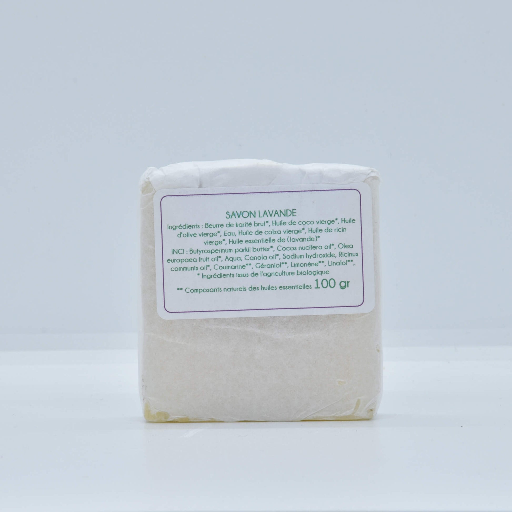 Fabriqué localement par notre partenaire savonnière, labellisée Nature & Progrès, tous les ingrédients sont issus de l'agriculture biologique, l'huile essentielle de lavande vraie bio est issue de nos parcelles berrichonnes.